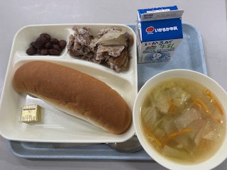 今日の献立は、コッペパン、豚肉のバジル焼き、スープ、うずら豆のグラッセ、バターです。