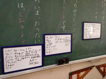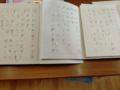 号車に分かれて、なかまのことばをたくさん考えるゲームをした後、それを使って文にしました。