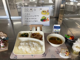 ごはん、豚肉の生姜焼き、さつまいもの味噌汁、きくなとはくさいの胡麻和えです。