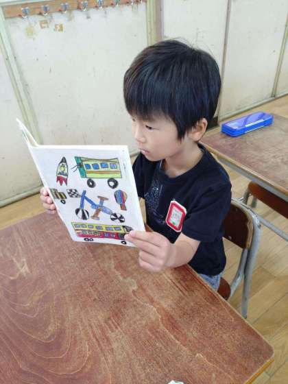 「いろいろなふね」で文の書き方を学び、本から調べた乗り物を説明した図鑑が完成しました。