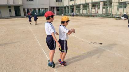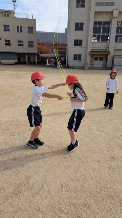 今日はなわとびカードには無い技、「2人跳び」に挑戦しました。2人跳びにもいろんな跳び方があるので、まずは跳び方を周知してから、練習しました。