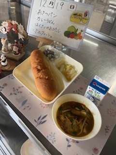 今日の献立は、おさつパン、牛乳、カレーうどん、はくさいのおひたし、ミニフィッシュです。