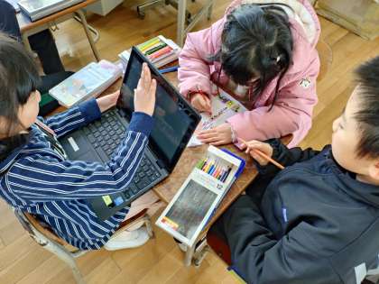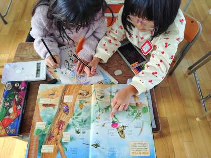 係ポスターも、図鑑を広げたりパソコンを開けたりと、自分のやりたい調べ方で友だちと協力して作っています。頼もしい1年生です。