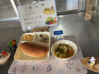 今日のこんだてはこくとうぱん、てぼまめのスープ煮、あじのレモンマリネ、白桃です。