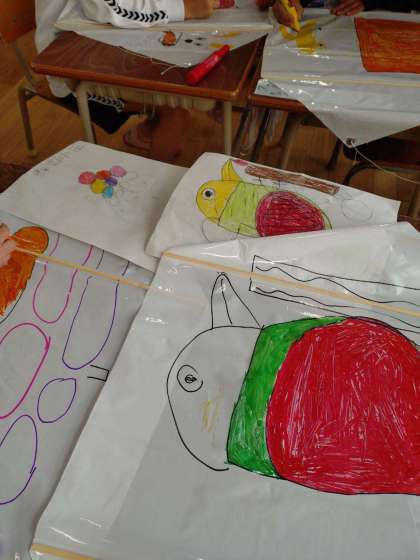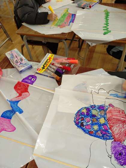 机よりも大きなビニールに、めいいっぱいの絵を描いている1年生。
