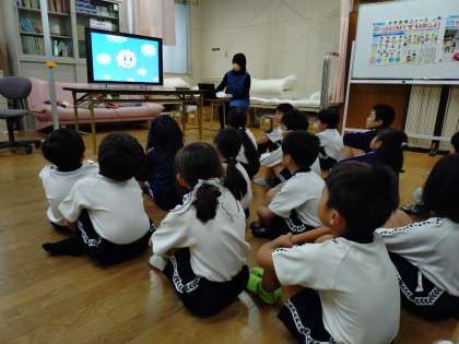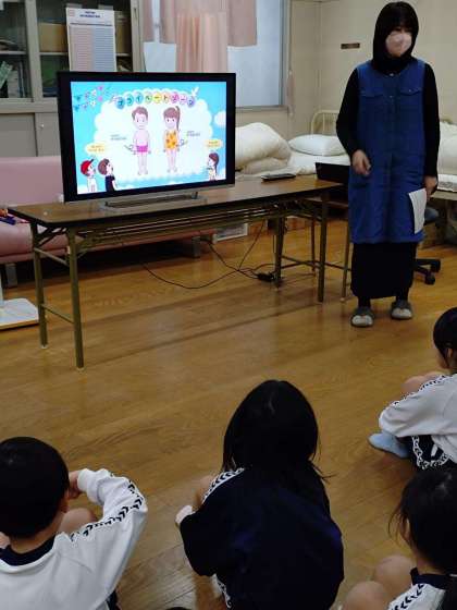 まずはプライベートゾーンのお話を聞きました。水着で隠れるところ、お口は自分の大事なところ。他の人に見せたり触らせたりしない、と約束しました。