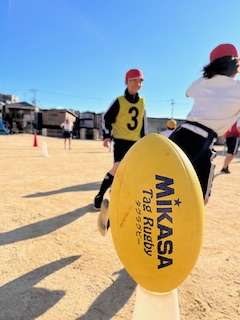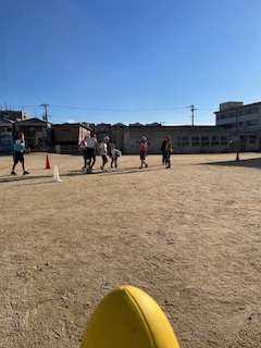 3学期はタグラグビーをしています。今日はラグビーボールに慣れ親しみ、その後タグをつけてタグ取り鬼をしました。