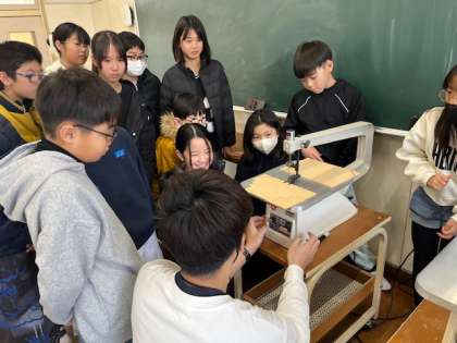 伝言ボードを作っています。下絵が描けたら、いよいよ板を切ります。子どもたちにとっては初めての電動のこぎりですが、ペアで協力しながら進めることができました。