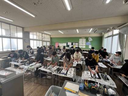 書き初めをしました。みんなで起立し、腕をまくって文字の形に注意しながら書いています。