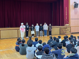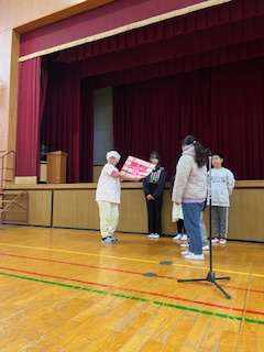 お忙しい中、朝会で給食調理員さんをご招待し、みんなでつくったメッセージカードをお渡ししました。