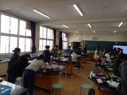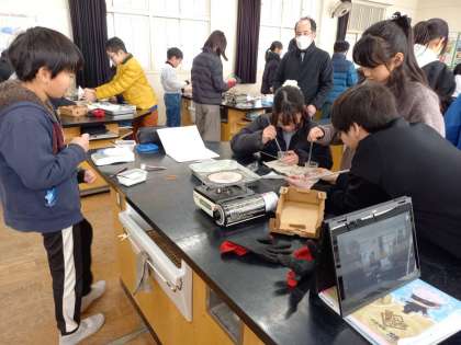 温度を変えると物がどう変わるのか実験をしています。温度が冷えないように、一生懸命混ぜています。