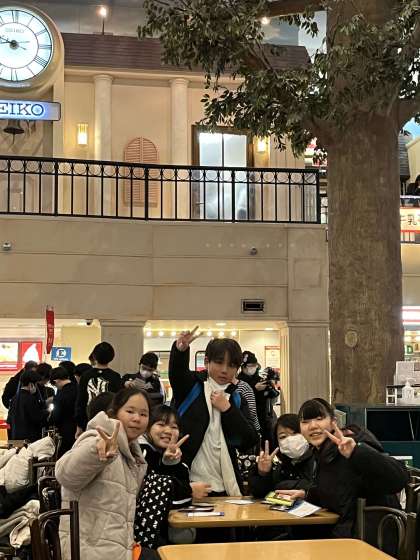 次のパビリオン予約までの時間に、みんなで仲良く相談中。