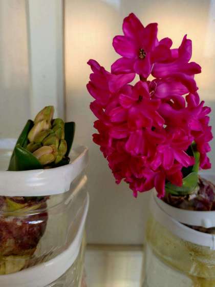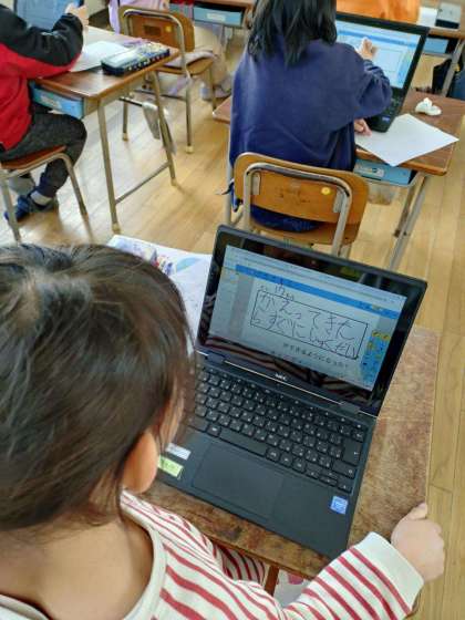 今日は、タブレットで写真や文字を挿入し、スライドを2枚完成させました。参観で披露しますので、楽しみにしていてくださいね。また靴箱上にも子ども達が大切にお世話しているヒヤシンスが咲いていますので、見てください。とってもいい香りがしますよ。