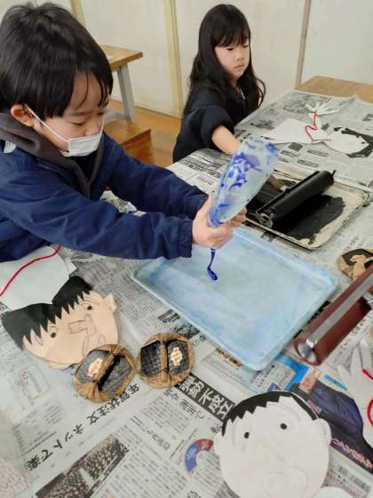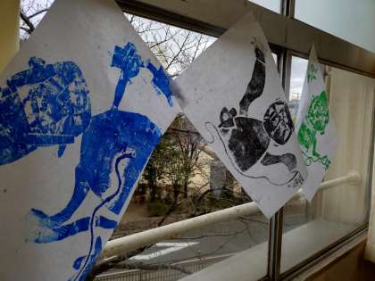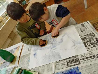 頑張って作ってきた版画にインクをつけて、刷りました。