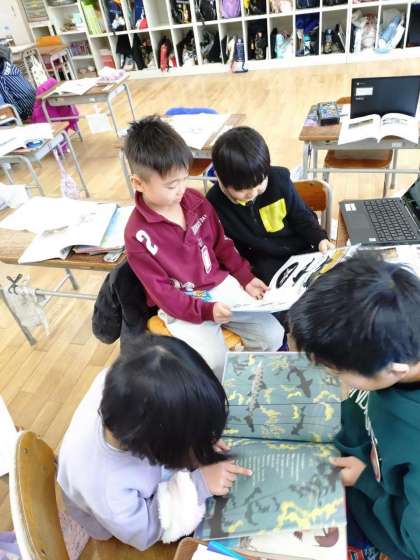グループで話し合った動物を、本やタブレットを使い調べます。