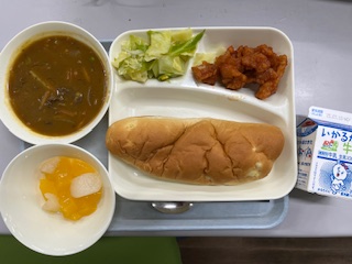 おさつパン、カレースープ、あげどりのバーベキューソース、キャベツとコーンのサラダ、フルーツゼリーです。