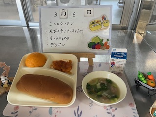 今日は黒糖パン、えびのチリソースいため、中華粥、デコポンです。