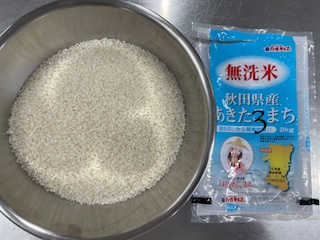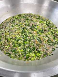 給食の中華粥は、米のほかに肉だんご、チンゲンサイ、大根、にんじん、しいたけが入っています。