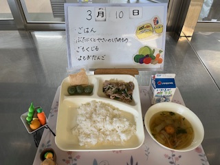 今日の献立はごはん、五目汁、豚肉と野菜の炒めもの、よもぎ団子です。