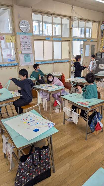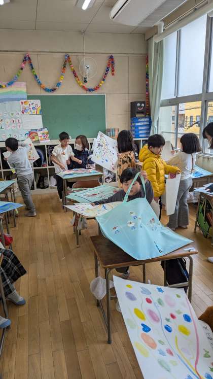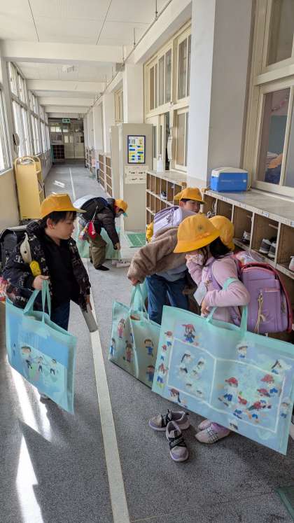 1年間で頑張ったことを思い出しながら配付し、持ち帰り袋に詰めて・・・をくり返し、作品袋がパンパンになりました。