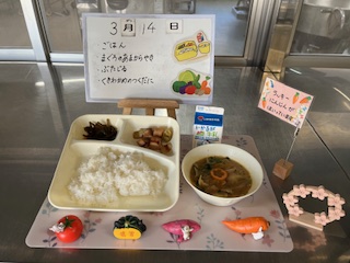 3月14日(金)の献立は、ごはん、ぶたじる、マグロの甘辛焼き、くきわかめの佃煮です。