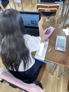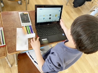 タブレット端末や、下敷き・筆箱・ノートに書かれている好きなキャラクターを見ながらイラストを描きました。