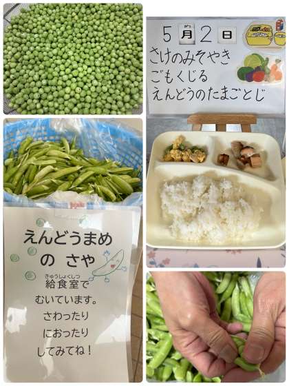 今が旬のえんどう豆は、給食室で一つ一つさやからむいて、愛情たっぷりに調理されていました^_^。