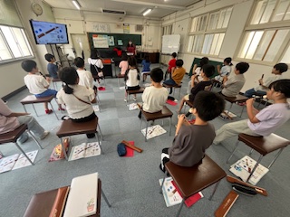 マウスピースで色々な音を試したあと、一人ずつ「シ」の音を鳴らしてみました。みんな上手に音を出すことができたので、タンギングにも挑戦しました。