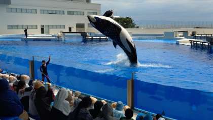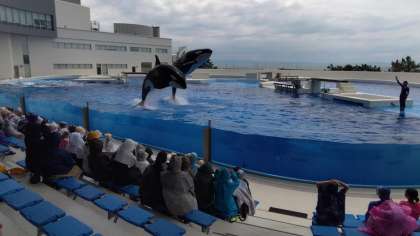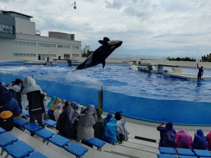 オルカショーも続いて楽しみました。裸足にレインコートで準備万端でしたが、オルカはイルカよりも迫力満点で、水にたくさん濡れながら楽しみました!