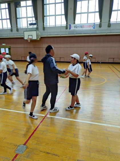 写真は、運動クラブでドッジボールを色んなパターンで楽しんでいるところです。