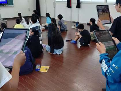 雨で浸水した教室でみんなが浸かっている状態からのスタートで、問題に正解するごとに水が少しずつひいていきます。正解していき、人類を救うというコンセプトで子ども達は真剣そのもの。