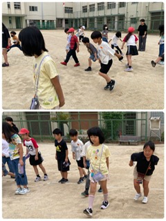 算数科で、10mがどれくらいの長さなのか体感してもらうために、運動場に出て実際に測ってみました。