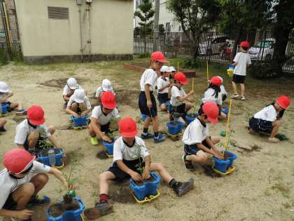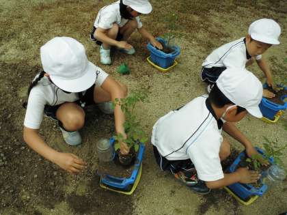 5月9日(火)にミニトマトを自分の鉢に植える学習をしました。土を耕して、ミニトマトの苗を一生懸命植えていました。その他にも、なすび等植えました。これから、2年生全員でしっかり水を上げてお世話をしていきます。