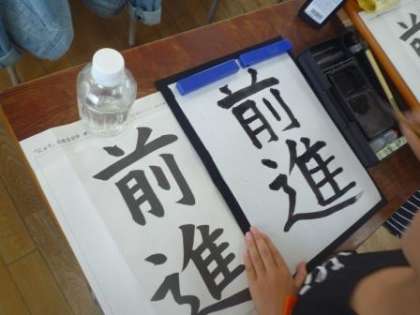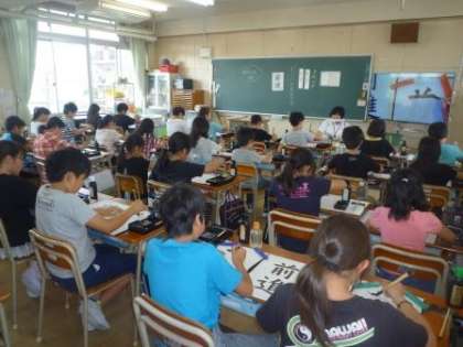 本日、5年生は、習字の授業を行いました。今日は、「前進」という字を書きました。「しんにょう」を部首に持つ字で、形をとるのが難しいので、何回も練習をしました。大型テレビに、先生が書く様子を映して、みんなはそれを見ながら、一緒に書きます。暑い中、みんな集中して書くことができました。