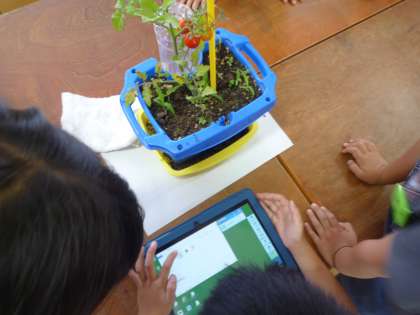 2年生は、生活科で、ミニトマトを育てています。今回は、タブレットを使って、大切に育てているミニトマトの写真を撮ることに挑戦! 先週は、隣のクラスがしていたので、子どもたちも楽しみにしていたようです。みんなが使うタブレット。まずは、手をきれいに洗って準備をします。初めて触るタブレットに、みんな少し緊張気味・・・! 先生に写真の撮り方や、名前のつけ方を教えてもらった後は、実際にグループに一台のタブレットを使って、練習タイム。みんなで協力して活動できました。