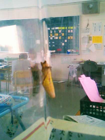 なかよし学級でアゲハチョウを育てています。校内で採集してきた幼虫(青虫)が「さなぎ」になりました。観察していると、色も少し茶色に変色してきました。成虫(アゲハチョウ)になるのもあと少しでしょうか・・・