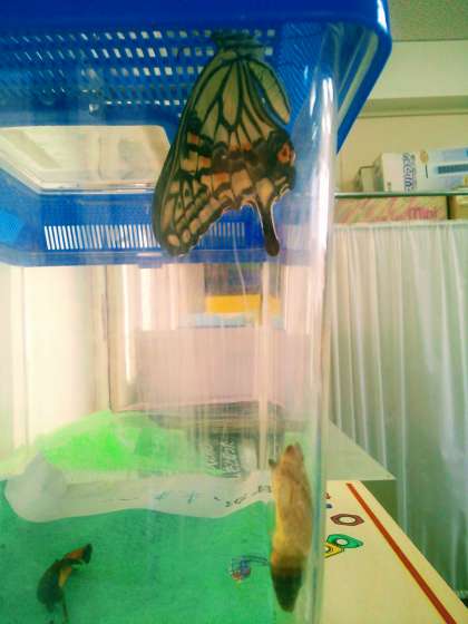 6月16日(金)、なかよし学級で大切に育ててきたアゲハの幼虫が、さなぎの殻を破って、ついにアゲハチョウに成長しました。