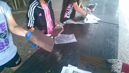杉の木の板には、すすがたくさん付いています。真っ黒なすすをブラシで落としました。