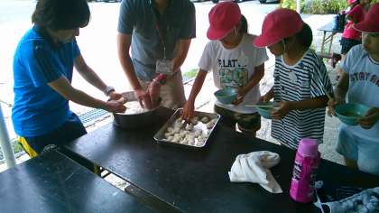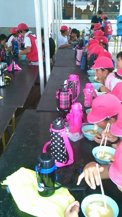自分たちでついたお餅を豚汁に入れて食べました。お餅のおかわり続出。お腹いっぱい、美味しくいただきました。