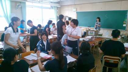 スムーズに授業がスタートできるように教職員もこの夏に研修を重ね、頑張っています。写真は講師を招き、英語を楽しく学ぶための授業作りを、他の小学校の先生といっしょに研修している様子です。
