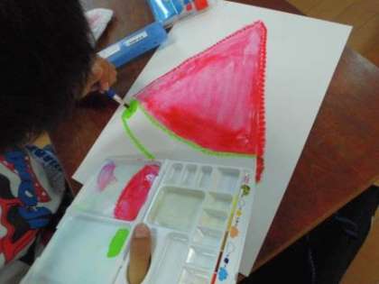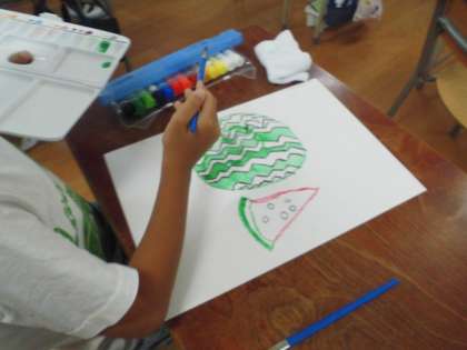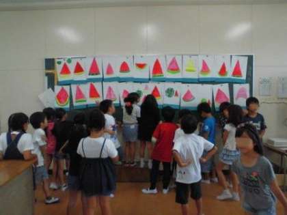 みんな友達の絵をみて、「うまい」、「このスイカ面白い」など楽しそうな声が教室を包んでいました。