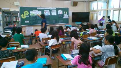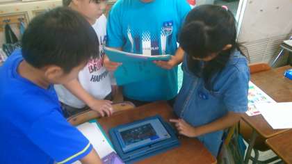 この授業では、スーパーマーケットがどのような工夫をして商品を売っているかなどを、社会見学で調べてまとめた資料をグループごとにタブレットを使って、説明したり、発表したりしました。