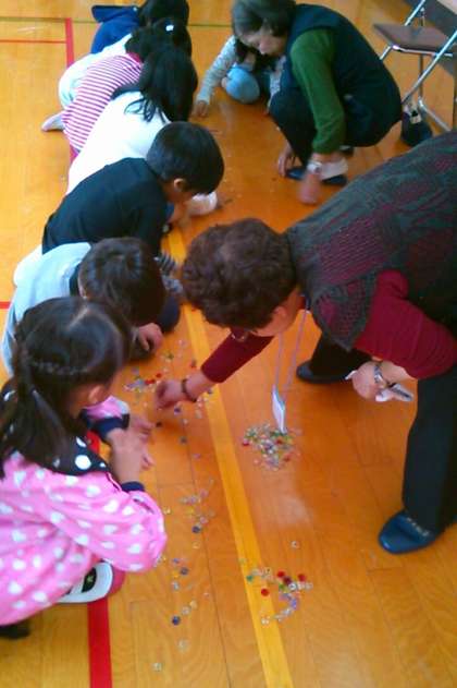 子どもたちは、「あやとり」「けんだま」「おはじき」「こままわし」「おてだま」「てづくり」の6つのコーナーに分かれて、技を伝授していただきました。みんな大喜び。難しい遊びもありましたが、みんな一生懸命、和気あいあいと楽しく交流ができました。