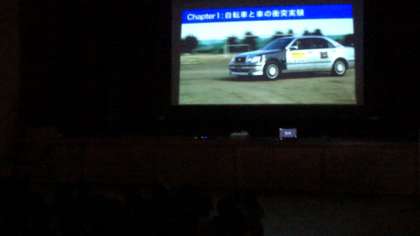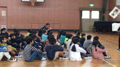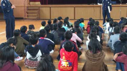 当初は自転車を使って安全について学ぶ予定でしたが、あいにくの雨天でしたので講堂で学びました。