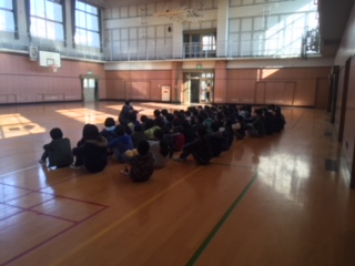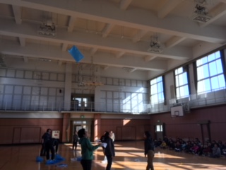 今回の実験場所は理科室ではありません。なぜなら熱気球を飛ばすからです。今回は4年生とお手伝いの先生と一緒に講堂で実験しました。