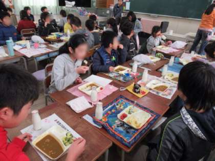 卒業する6年生を囲んで、お祝いの気持ちを込めて楽しく食事をしました。