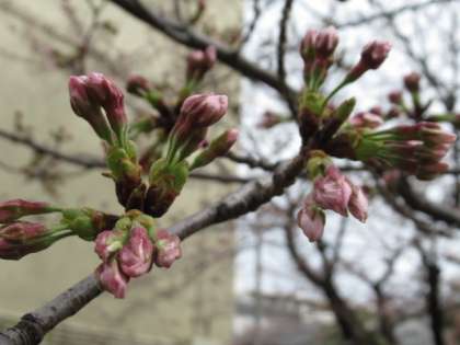 学校の東門近くの桜の木。すでに花を咲かせていました。二分咲きくらいですか・・・
