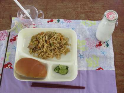 焼きそば きゅうりのしょうがづけ パン 牛乳