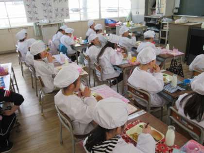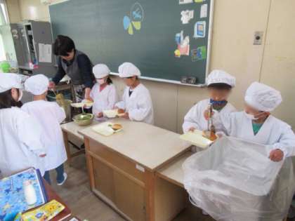 「いただきます」の挨拶で給食を食べ始めました。感想を聞いてみると、「おいしい」との声。おかわりをする子もいました。小学校での楽しい初めての給食となりました。