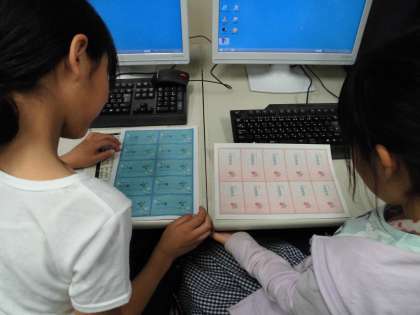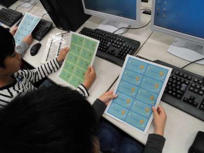 4年生が、宇野先生にパソコンルームで名刺づくりを教えてもらいました。